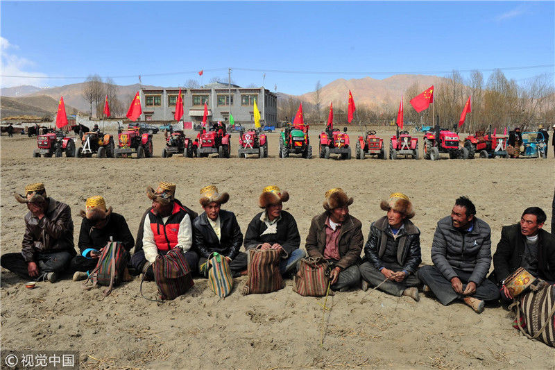 3月16日,山南市乃東區(qū)克松社區(qū)居民在開耕儀式上。 當(dāng)日,西藏各地男女老幼身著節(jié)日盛裝,駕著一輛輛由彩旗、花朵裝扮一新的拖拉機(jī),涌向待墾的農(nóng)田,載歌載舞迎來一年一度的開耕儀式。 新華社記者 李鑫 攝