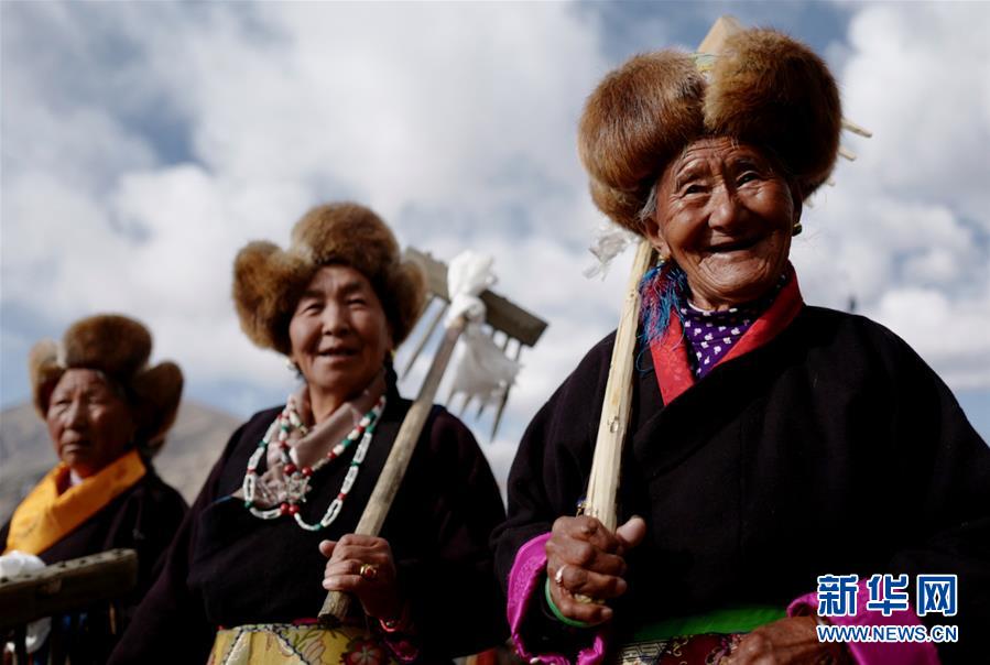 3月16日,山南市乃東區(qū)克松社區(qū)居民在開耕儀式上。 當(dāng)日,西藏各地男女老幼身著節(jié)日盛裝,駕著一輛輛由彩旗、花朵裝扮一新的拖拉機(jī),涌向待墾的農(nóng)田,載歌載舞迎來一年一度的開耕儀式。 新華社記者 普布扎西 攝