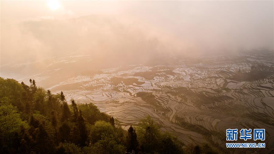 這是在云南省元陽縣拍攝的晨曦中的哈尼梯田美景(4月4日無人機(jī)拍攝)。哈尼梯田位于云南省哀牢山南部,以哈尼族為主的當(dāng)?shù)厝罕娗О倌陙砩幌⒃诖蟮厣稀暗窨獭背鲞@一農(nóng)耕文明奇觀。春日里,漫山的水稻梯田與云海、森林、村莊形成一幅美麗的畫卷,吸引眾多海內(nèi)外游客前來觀賞。新華社記者 胡超 攝