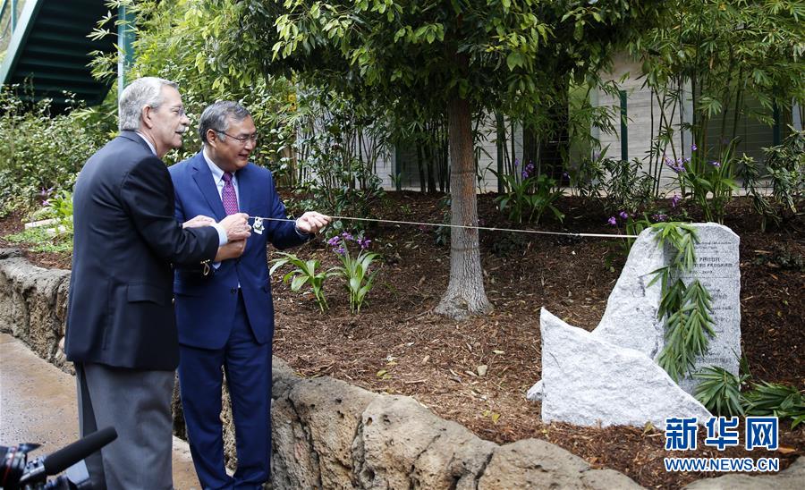 4月6日,在美國圣迭戈動物園,中國駐洛杉磯總領(lǐng)事張平(右)為“大熊貓保護(hù)項目”紀(jì)念碑揭幕。新華社記者李穎攝
