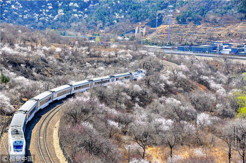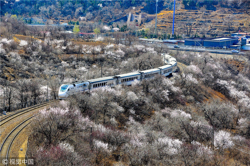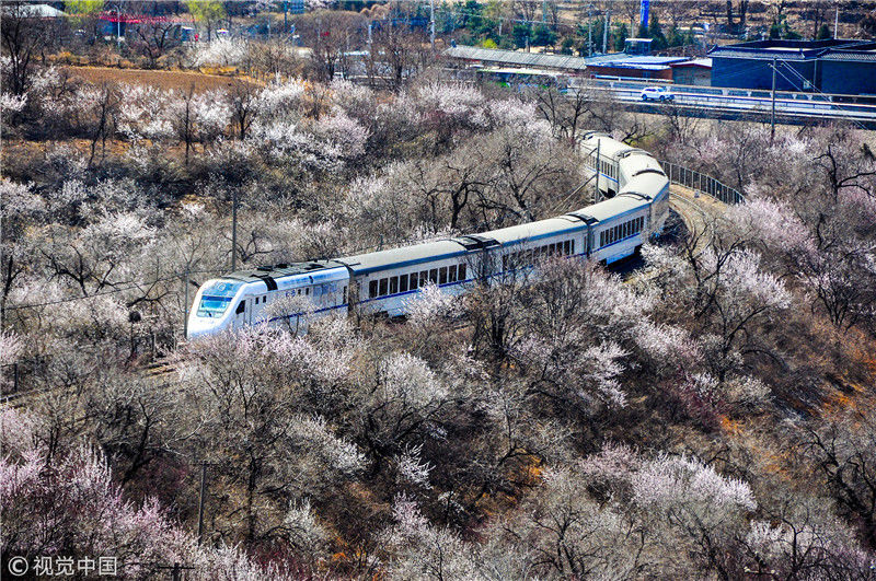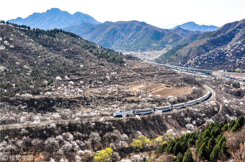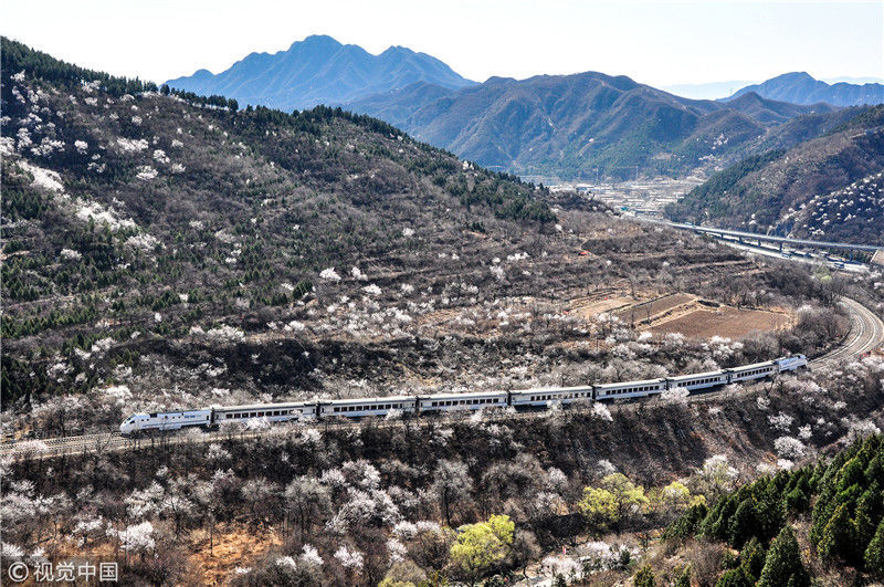 2019年3月22日,北京居庸關(guān)附近的山花盛開,S2線列車穿行在花海之中,構(gòu)成一幅美麗的畫面。時永平/千龍圖像/視覺中國 編輯/陳進