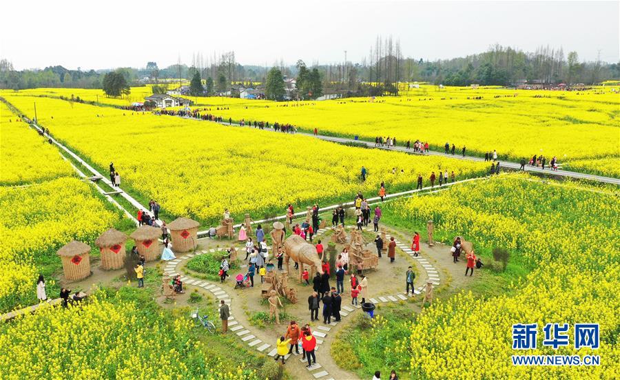 在四川都江堰市柳街鎮(zhèn)七里詩鄉(xiāng),游客在油菜花地里休閑游玩(3月16日無人機(jī)拍攝)。 新華社記者 江宏景 攝