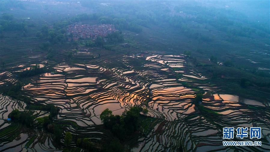 這是在云南省元陽縣拍攝的傍晚時分的哈尼梯田美景(4月3日無人機拍攝)。 新華社記者 胡超 攝