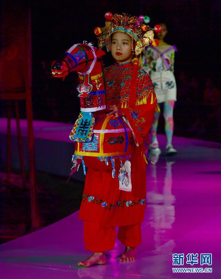 4月27日,小模特身穿民族服飾展示土樓當?shù)氐姆俏镔|文化遺產竹馬戲。 當日,土樓光語國際時尚大秀在福建省南靖縣的土樓裕昌樓內舉行。這場融匯文化、時尚與旅游元素的大秀,通過傳統(tǒng)與時尚的有機融合,展現(xiàn)南靖土樓及文化的魅力和風采。 新華社記者魏培全攝