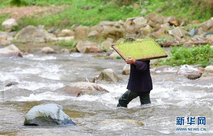 在黔桂烏英苗寨,村民扛著秧苗過河,準備插秧(4月16日攝)。 新華社記者 黃孝邦 攝