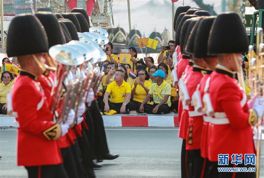 5月5日,儀仗隊(duì)在曼谷大王宮附近舉行的泰國(guó)國(guó)王加冕典禮巡游上列隊(duì)前進(jìn)。  新華社記者 張可任 攝