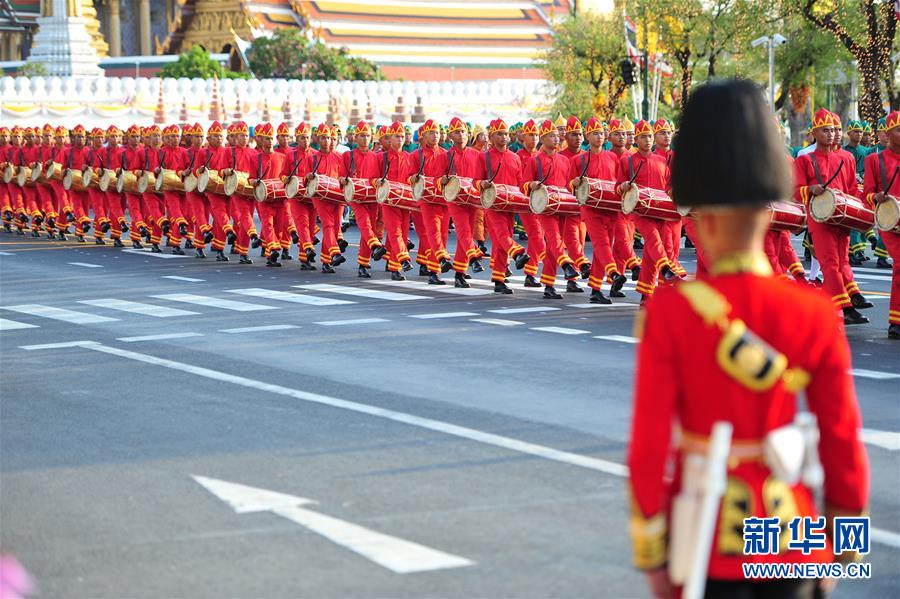 5月5日,儀仗隊在曼谷大王宮附近舉行的泰國國王加冕典禮巡游上列隊前進(jìn)。 新華社發(fā)(拉亨攝)