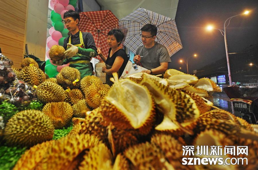 2017年6月5日夜里,武漢一家水果店正進(jìn)行金枕榴蓮打折促銷(xiāo),門(mén)前堆積如山的榴蓮殼頗為壯觀,不少市民聞著榴蓮散發(fā)的濃郁味道前來(lái)排隊(duì)選購(gòu),雨夜里食客們依舊絡(luò)繹不絕。