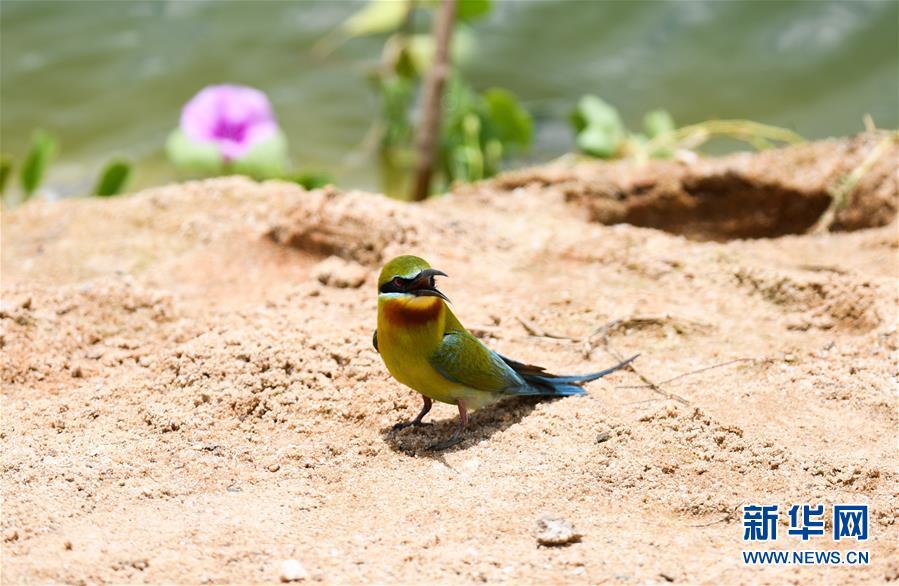 5月14日,栗喉蜂虎在沙地上活動(dòng)。 新華社記者 楊冠宇 攝