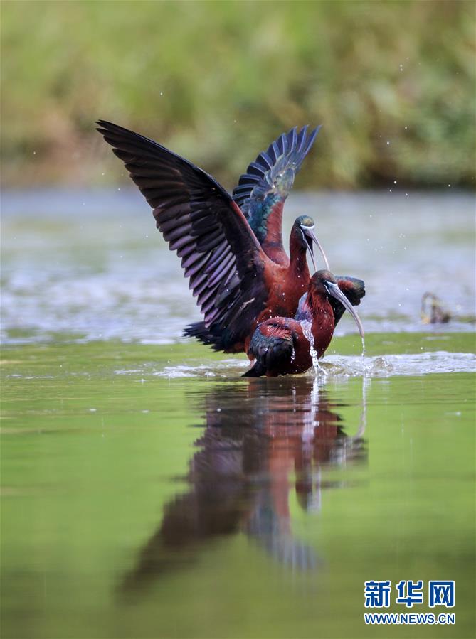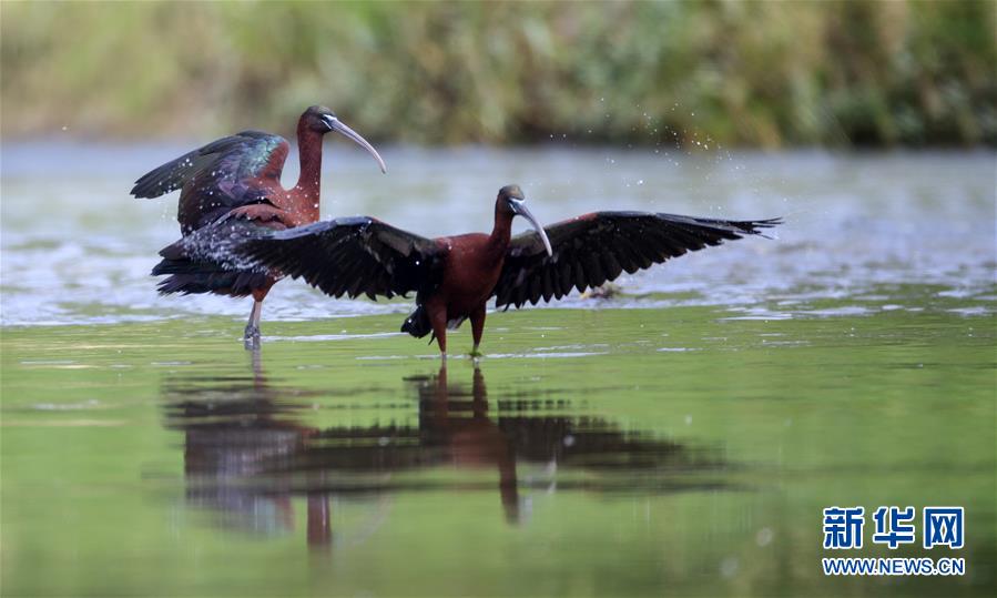 這是在漢江濕地公園嬉水的2只彩鹮(5月4日攝)。 近日,國家二級(jí)保護(hù)動(dòng)物彩鹮現(xiàn)身陜西省漢中市漢江濕地公園濂水河與漢江交匯處。 據(jù)陜西師范大學(xué)生命科學(xué)院教授于曉平介紹,彩鹮在世界上的分布比朱鹮還要少,這幾年在云南發(fā)現(xiàn)得多一些,這3只彩鹮現(xiàn)身漢江濂水河畔,是陜西首次發(fā)現(xiàn)彩鹮蹤跡。 據(jù)了解,彩鹮是國家二級(jí)保護(hù)動(dòng)物,屬鵜形目鹮科,體羽大部為青銅栗色,是珍稀鳥類朱鹮的“近親”,體型比朱鹮略小。 新華社發(fā)