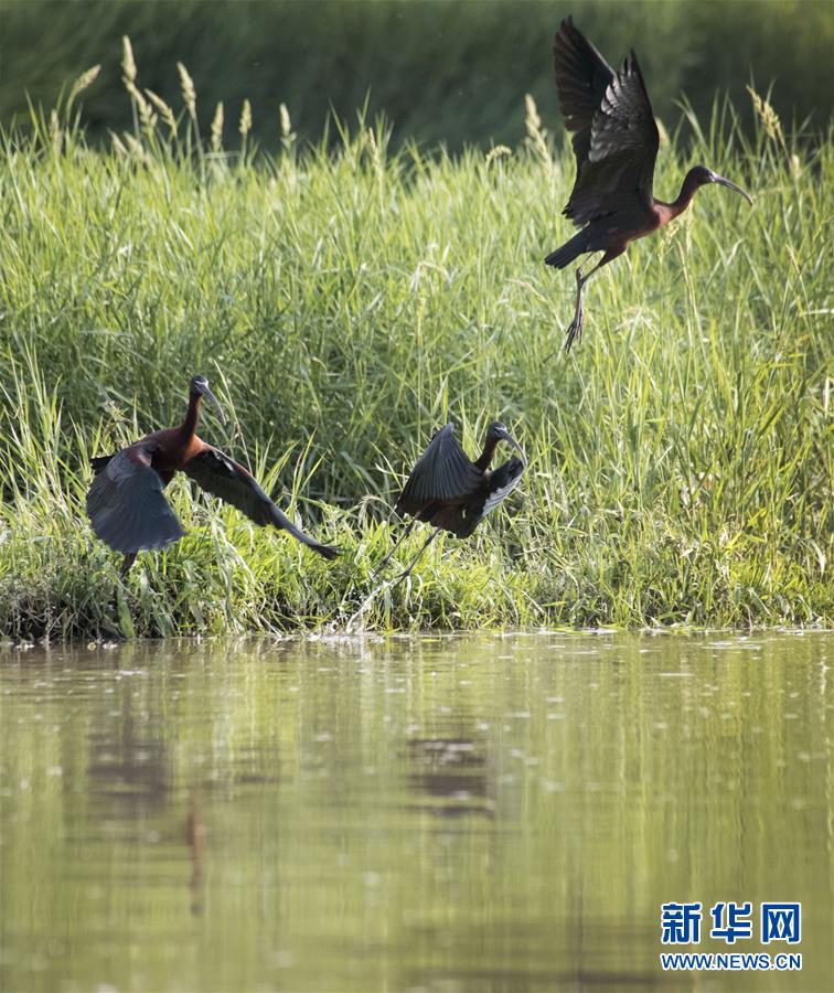 這是在漢江濕地公園飛翔的3只彩鹮(4月29日攝)。 近日,國家二級(jí)保護(hù)動(dòng)物彩鹮現(xiàn)身陜西省漢中市漢江濕地公園濂水河與漢江交匯處。 據(jù)陜西師范大學(xué)生命科學(xué)院教授于曉平介紹,彩鹮在世界上的分布比朱鹮還要少,這幾年在云南發(fā)現(xiàn)得多一些,這3只彩鹮現(xiàn)身漢江濂水河畔,是陜西首次發(fā)現(xiàn)彩鹮蹤跡。 據(jù)了解,彩鹮是國家二級(jí)保護(hù)動(dòng)物,屬鵜形目鹮科,體羽大部為青銅栗色,是珍稀鳥類朱鹮的“近親”,體型比朱鹮略小。 新華社發(fā)(陶本耀 攝)
