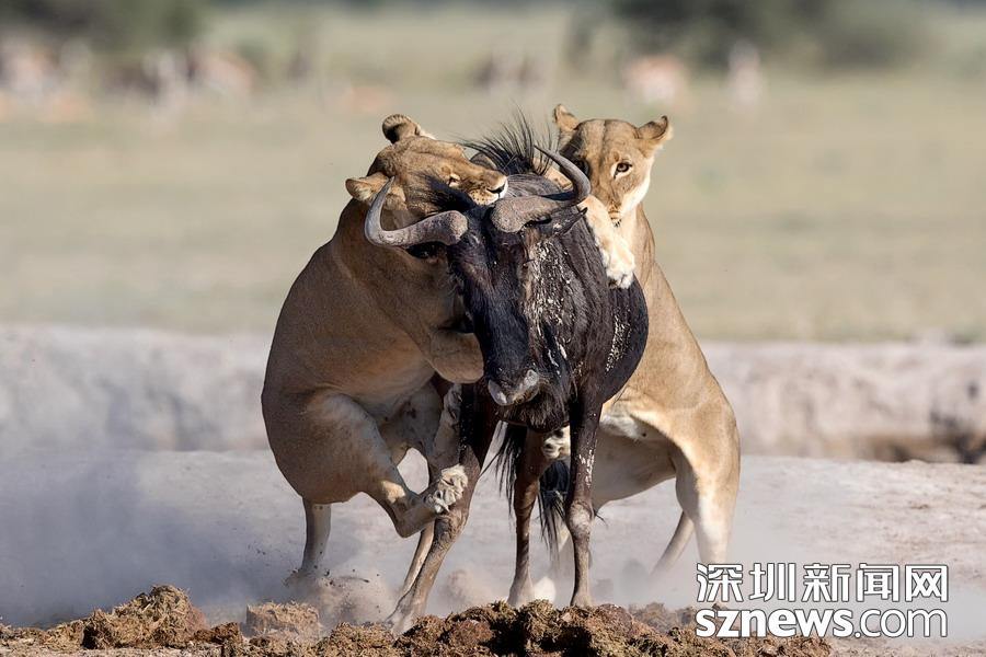 英國(guó)攝影師蘇-莫里斯(Sue Morri)在博茨瓦納Nxai Pan國(guó)家公園游玩,目睹了一場(chǎng)兇惡母獅獵食角馬的畫面。母獅甚至攀到了角馬背上,想要牢牢遏制住到手的“美餐”。強(qiáng)壯的角馬努力地與母獅抗?fàn)?,竭力想要保住自己的性命,但最終還是不敵母獅被拿下,最后成了母獅孩子們的盤中餐。