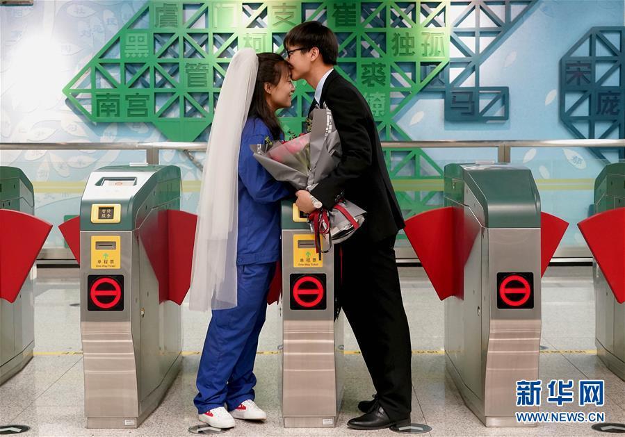 5月20日,兩名參與地鐵5號線建設的工作人員在求婚后拍照留念。 當日,鄭州地鐵5號線開始初期運營。作為鄭州軌道交通線網(wǎng)中首條環(huán)線,5號線全長40余公里,設站32座。 新華社記者李安攝