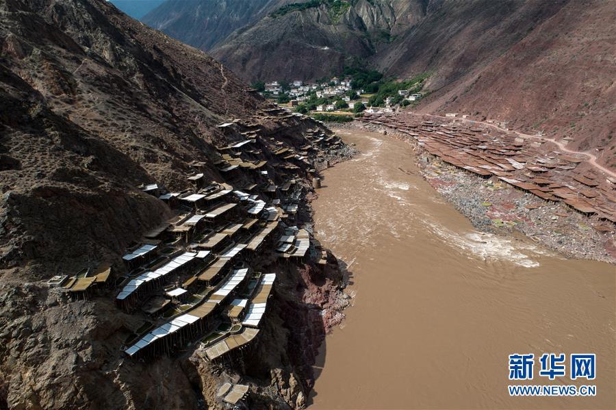 這是西藏芒康縣納西民族鄉(xiāng)的古鹽田景觀(5月22日無人機拍攝)。 位于西藏昌都芒康縣瀾滄江畔的古鹽田,至今仍保持最原始的手工曬鹽方式。據(jù)史料記載,唐朝時期當?shù)鼐烷_始曬鹽。鹽田在瀾滄江兩岸依山而建,由多根木柱搭架,架上用透水性強的泥土鋪成平面夯實,當?shù)鼐用駨臑憸娼系柠}井、鹽池中取出鹵水倒入鹽田,經(jīng)陽光蒸曬、風干,結晶成鹽。遠遠望去,鹽田錯落有致,田中鹵水宛若鏡面,形成壯麗奇觀。 新華社記者 李鑫 攝