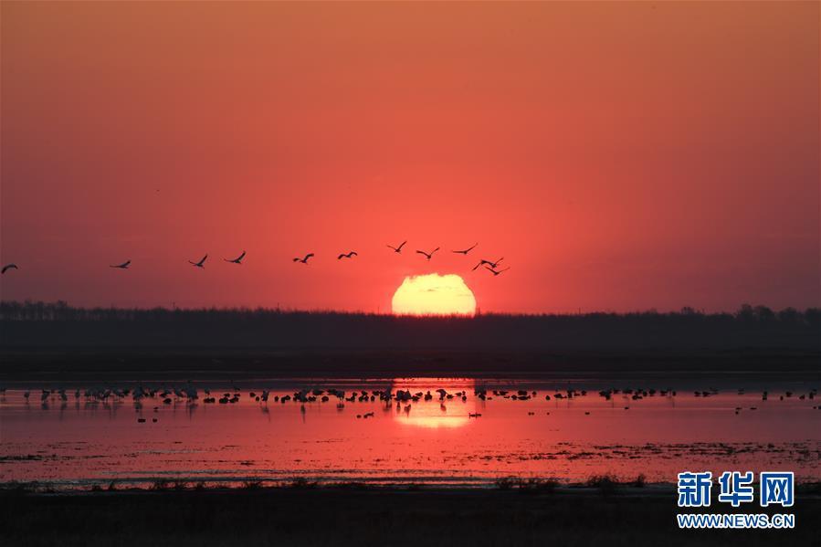 在吉林莫莫格國家級自然保護區(qū),一群白鶴從濕地上空飛過(4月11日攝)。 新華社記者 張楠 攝