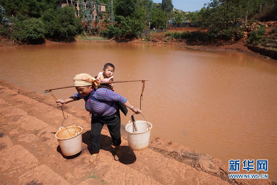 5月17日,巡檢司鎮(zhèn)烏稠村村民楊永珍從附近的壩塘挑水。 云南省紅河哈尼族彝族自治州彌勒市大部分地區(qū)氣象干旱等級近期已達中旱,其中山區(qū)和半山區(qū)達到重旱,18.8萬畝農(nóng)作物受旱,2700余人、960多頭牲畜飲水困難。當?shù)匾呀M織4.2萬人、1萬臺車輛投入抗旱工作。 新華社記者 秦晴 攝