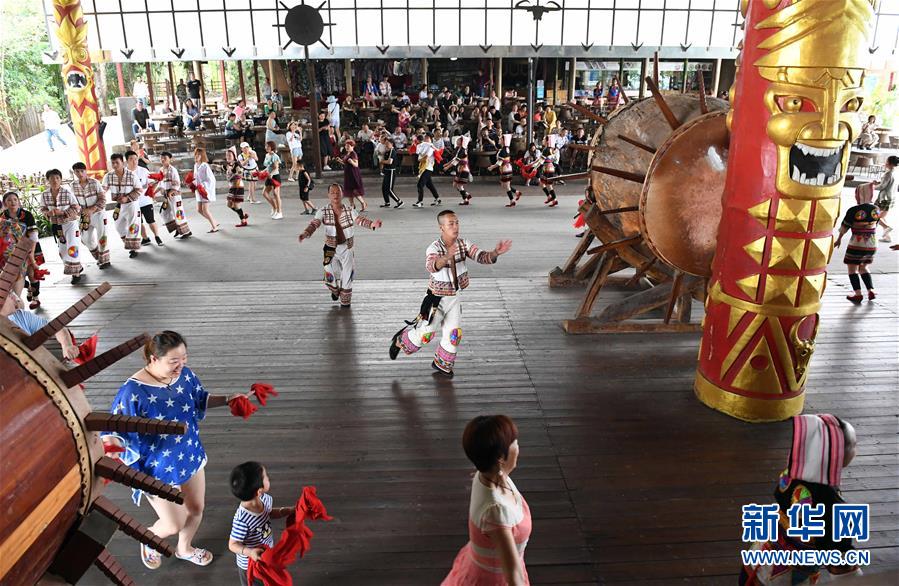 游客與基諾族大鼓舞演員一起跳舞(6月1日攝)。 在云南省西雙版納傣族自治州景洪市基諾山基諾族鄉(xiāng)的基諾族村寨,每天的基諾大鼓舞表演吸引了眾多游客前來觀賞體驗(yàn),帶動(dòng)了基諾族群眾就業(yè)和增收?;Z族大鼓舞蘊(yùn)涵豐富的歷史文化內(nèi)涵,已被列入國家級非物質(zhì)文化遺產(chǎn)保護(hù)名錄。 新華社記者 楊宗友 攝