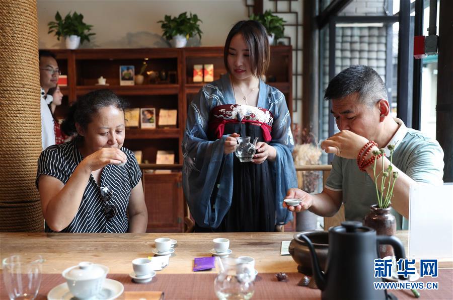 6月9日,在成都寬窄巷子古今茶語,兩位來自太原的游客參與品香猜茶互動游戲。新華社記者 江宏景 攝
