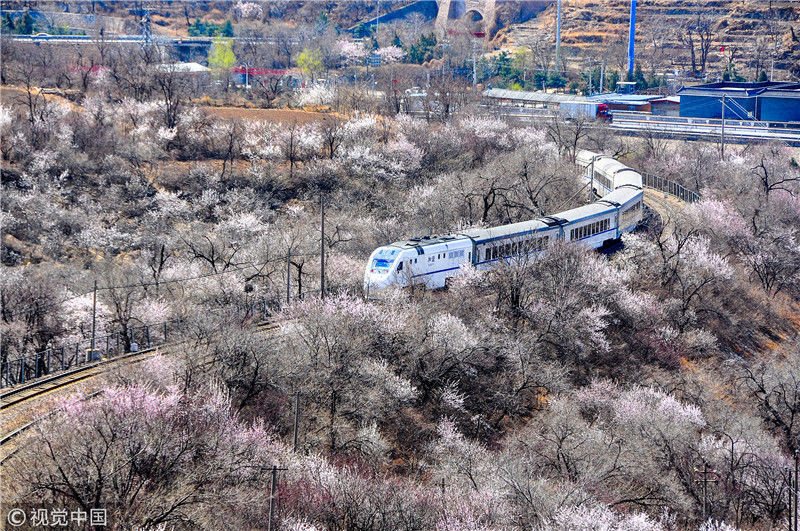 2019年3月22日,北京居庸關(guān)附近的山花盛開(kāi),S2線列車(chē)穿行在花海之中,構(gòu)成一幅美麗的畫(huà)面。時(shí)永平/千龍圖像/視覺(jué)中國(guó) 編輯/陳進(jìn)