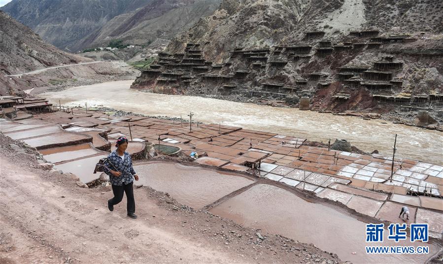 西藏芒康縣納西民族鄉(xiāng)加達(dá)村一名村民走過(guò)鹽田(6月4日攝)。新華社記者晉美多吉攝
