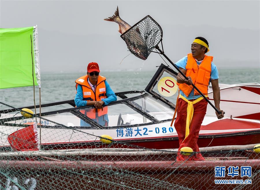 6月22日,博湖縣的魚把頭將開湖季打的第一網(wǎng)魚撈起。新華社記者 趙戈 攝