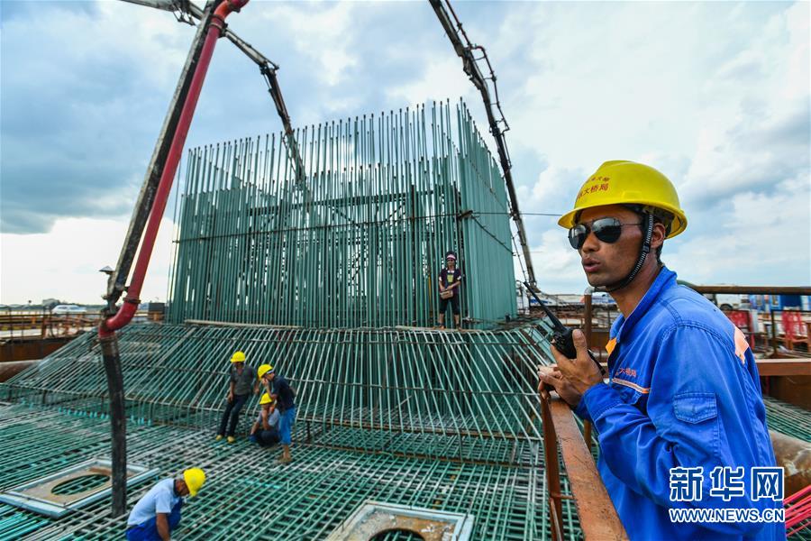 中鐵大橋局施工人員(右一)在湛江調順跨海大橋東岸主塔墩承臺現(xiàn)場指揮施工(7月6日攝)。 新華社記者 劉大偉 攝