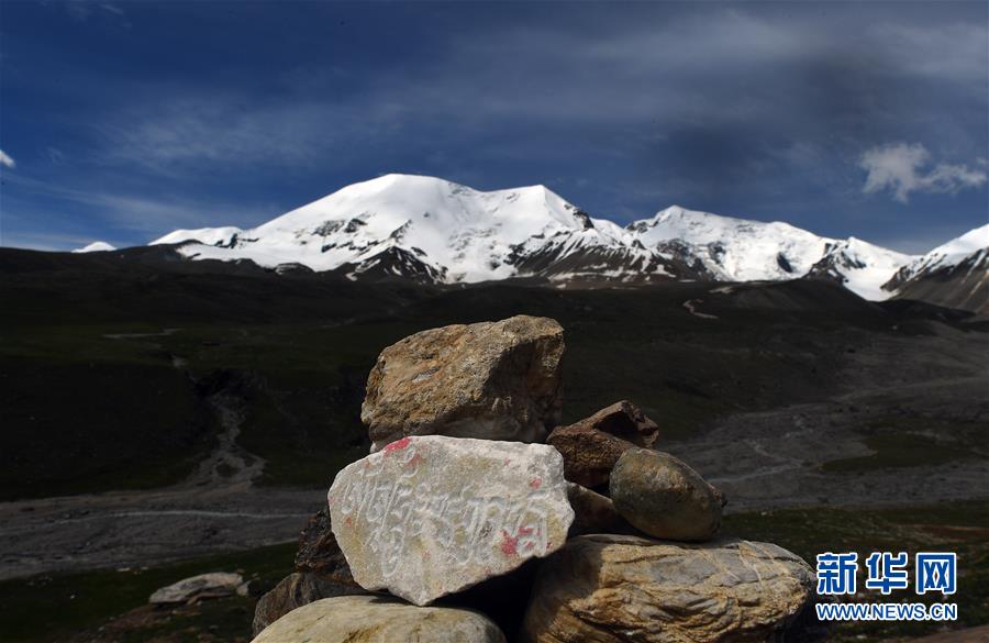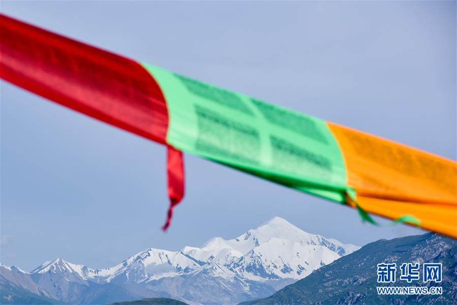7月10日,阿尼瑪卿雪山山下掛著經(jīng)幡。 新華社記者 張宏祥 攝