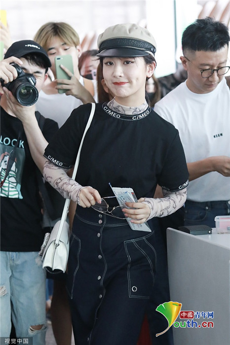 2019年7月25日,北京,楊紫現(xiàn)身機(jī)場。她穿黑色短T配牛仔裙變時髦女郎,戴報童帽架墨鏡”港風(fēng)女sir“即視感,人氣爆棚。