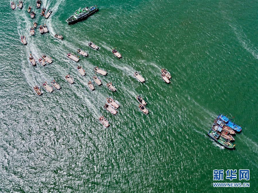 8月3日,首屆福清開(kāi)漁節(jié)增殖放流活動(dòng)上人們?cè)谙虼蠛M斗鹏~(yú)苗(無(wú)人機(jī)拍攝)。