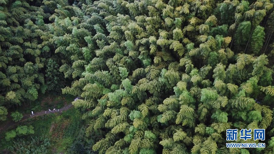 8月3日,游客行走在木坑竹海景區(qū)的小路上(無(wú)人機(jī)拍攝)。夏日,安徽省黃山市黟縣的木坑竹海景區(qū)風(fēng)景優(yōu)美,吸引不少游客前來(lái)休閑避暑。新華社記者張端攝