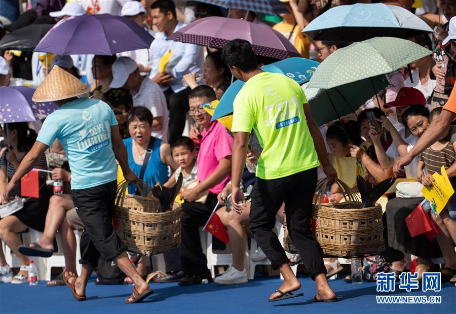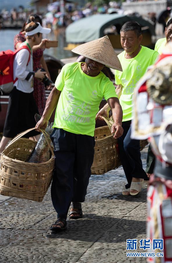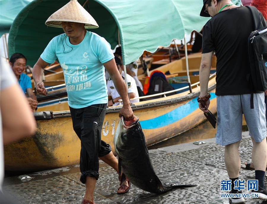 7月27日,在西昌邛海,漁民提著捕到的大魚參加比賽。新華社記者江宏景攝