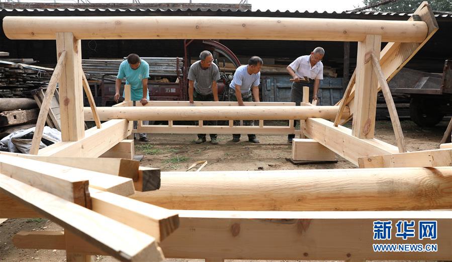 8月7日,在石家莊市井陘礦區(qū)橫西村,韓保元(右一)和工作人員在制作房架結構。