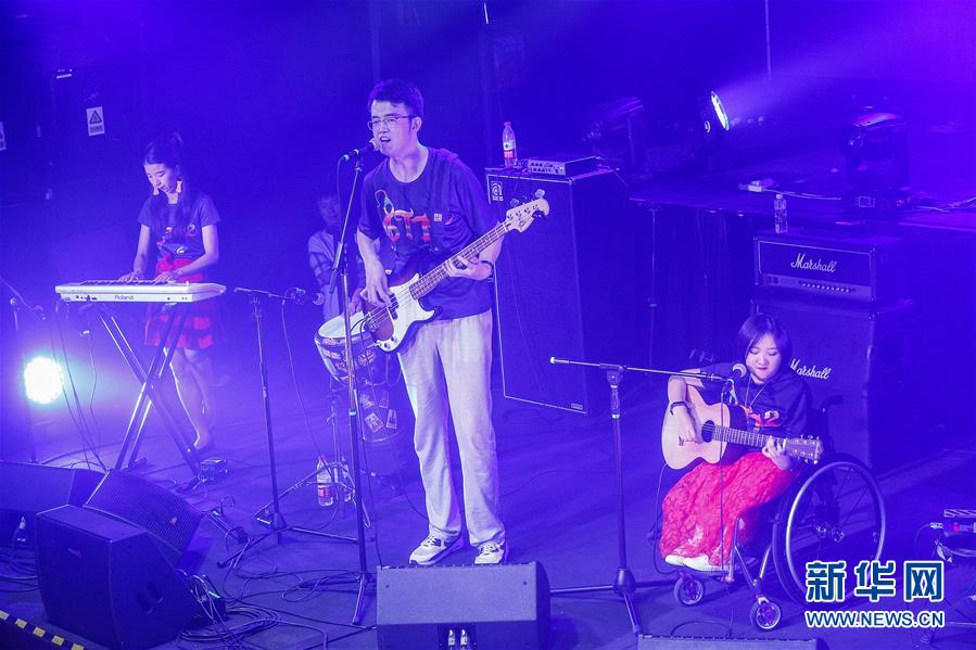 8月14日,8772樂隊發(fā)起人、隊長王奕鷗(中)和樂隊成員崔瑩(左)、程利婷在演唱會上表演。新華社記者張玉薇攝