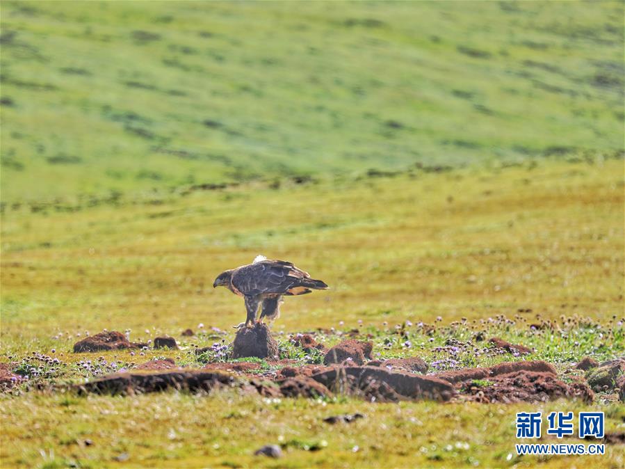 一只大鵟準(zhǔn)備享用捕獲的獵物(8月14日攝)。 8月12日至14日,來自全國各地的31名自然愛好者聚集在海拔4200米的青海省玉樹藏族自治州稱多縣嘉塘草原,參加“2019嘉塘自然觀察節(jié)”。自然愛好者用獨特視角記錄珍稀野生動植物,觀察三江源生態(tài)。 新華社記者 張大川 攝