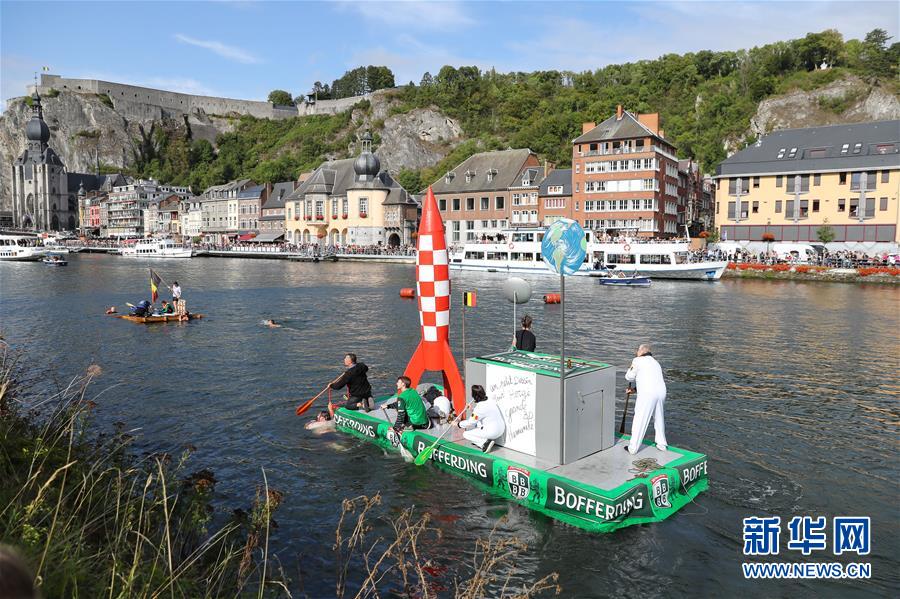 8月15日,在比利時(shí)南部小城迪南的默茲河上,人們參加“浴缸劃船節(jié)”的表演。