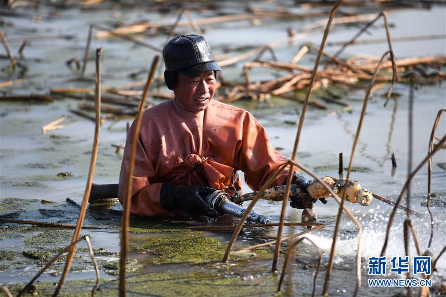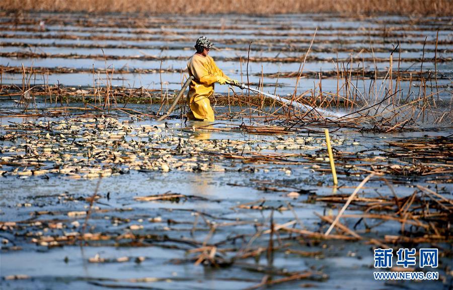 寒冬時節(jié),白洋淀里依然活躍著不少挖藕人,他們身穿橡膠工作服,在冰冷的水中辛勤工作。
