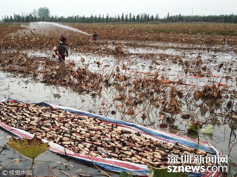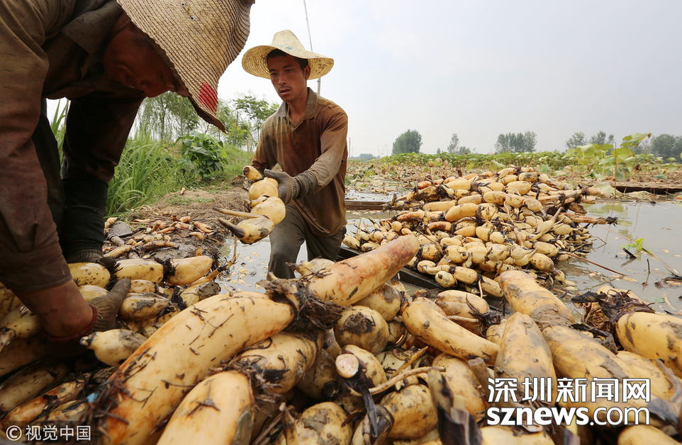 藕農(nóng)們抓緊采藕、清洗、包裝、運輸,以供應(yīng)市場。