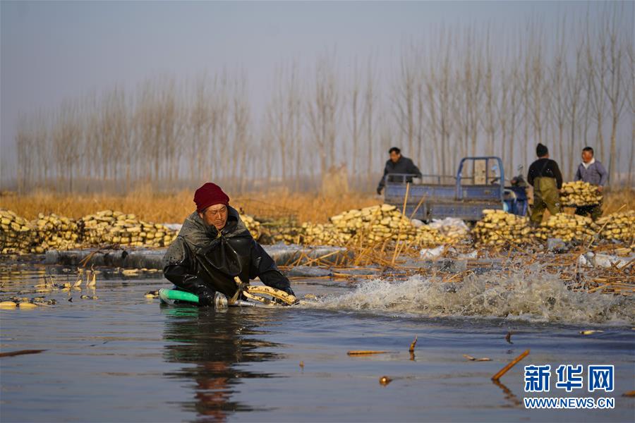 1月31日,在雄安新區(qū)安新縣東向陽村的一處藕塘,挖藕工將挖出來的藕洗干凈后裝車運走。新華社記者沈伯韓攝