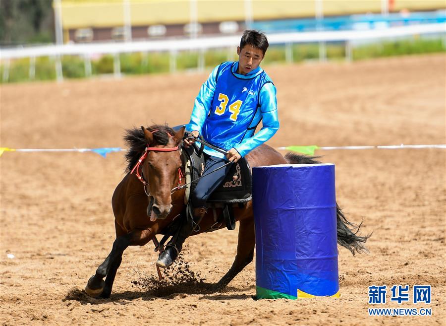 8月20日,騎手在“蒙古馬”傳統(tǒng)技巧表演中展示騎馬繞桶。 新華社記者 彭源 攝