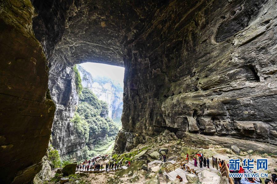 游客在天生三橋景區(qū)內(nèi)的天龍橋景點游覽(3月27日攝)。 新華社記者劉潺攝