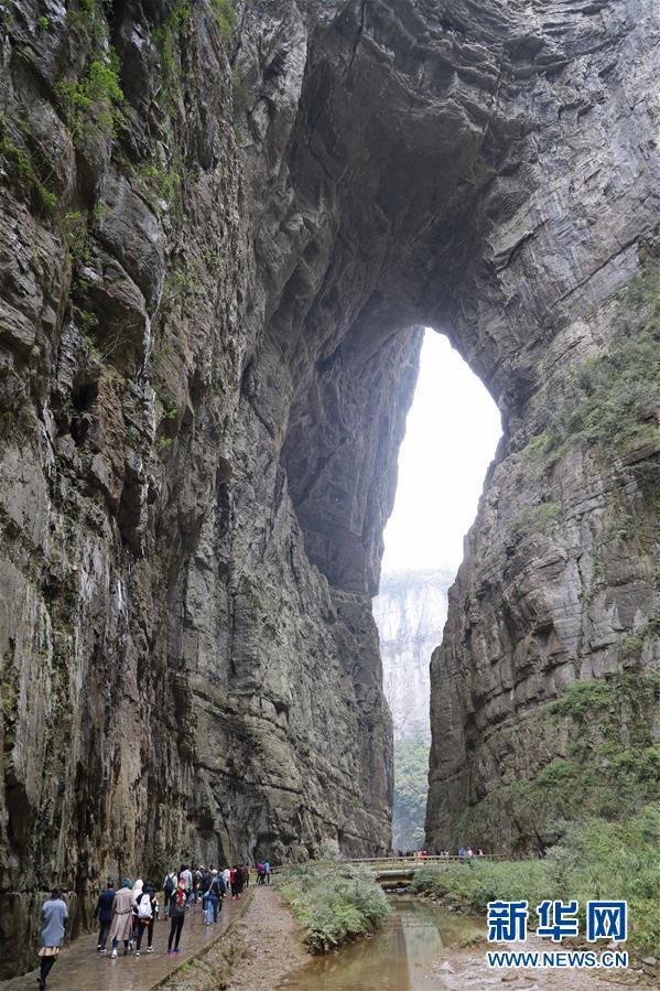 游客在天生三橋景區(qū)內(nèi)的青龍橋景點(diǎn)游覽(3月27日攝)。  新華社記者劉潺攝