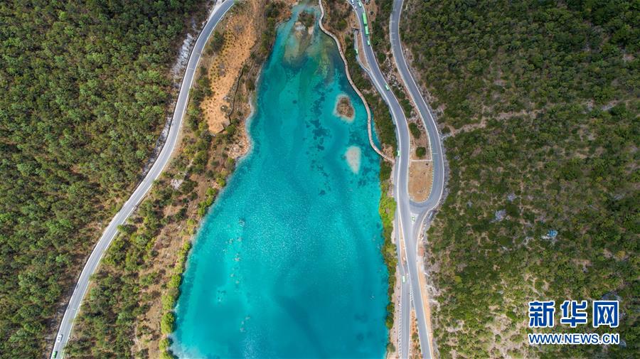 這是云南麗江玉龍雪山藍月谷景色(4月21日無人機拍攝)。 新華社記者胡超攝