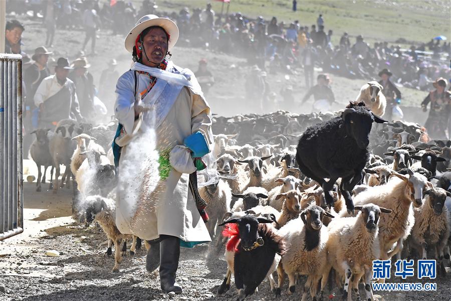 9月9日,羊群在進入場地時牧民撒青稞祈福。李鑫 攝