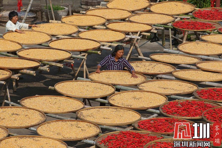 2019年9月9日,安徽黃山,呈坎古村村民在曬場(chǎng)上晾曬農(nóng)作物。
