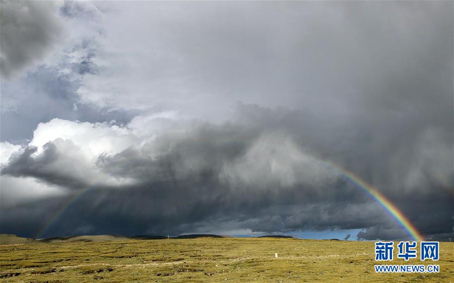 在青海省玉樹藏族自治州治多縣用手機拍攝的雨后彩虹(9月11日攝)。新華社記者 鄒樂 攝