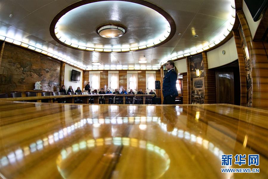9月14日,在俄羅斯摩爾曼斯克,人們?cè)诤藙?dòng)力破冰船“列寧”號(hào)內(nèi)部參觀。 新華社記者 白雪騏 攝