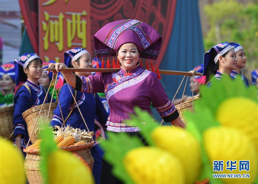 9月17日,廣西都安瑤族自治縣密洛陀文化公園廣場,演員在啟動儀式上表演節(jié)目《在希望的田野上》。 當日,2019年廣西慶祝“中國農民豐收節(jié)”啟動儀式暨河池市“慶豐收·促脫貧”系列活動在都安瑤族自治縣舉行,各族群眾和來賓一起載歌載舞歡慶豐收節(jié)。 新華社記者 陸波岸 攝
