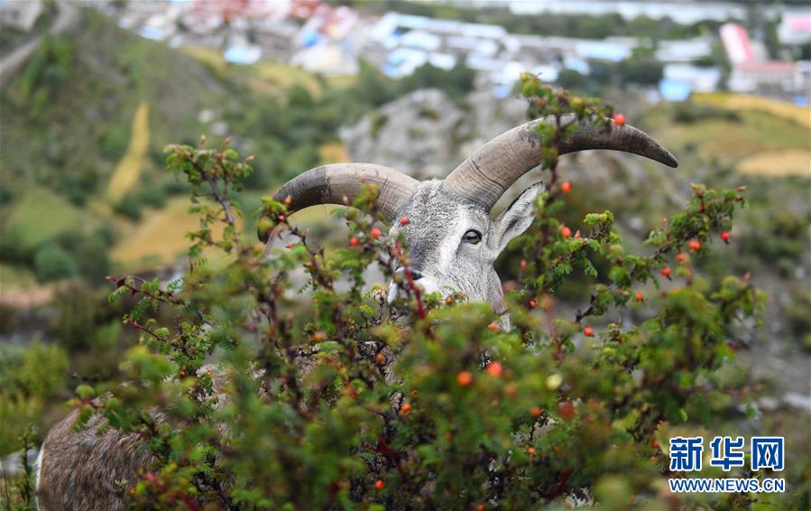 一只巖羊在西藏山南市洛扎縣色鄉(xiāng)海拔4000米左右的盤(pán)山路邊,悠閑地吃著野果青草(9月22日攝)。 新華社記者 晉美多吉 攝