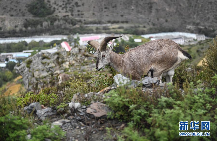 一只巖羊在西藏山南市洛扎縣色鄉(xiāng)海拔4000米左右的盤(pán)山路邊,悠閑地吃著野果青草(9月22日攝)。新華社記者 晉美多吉 攝