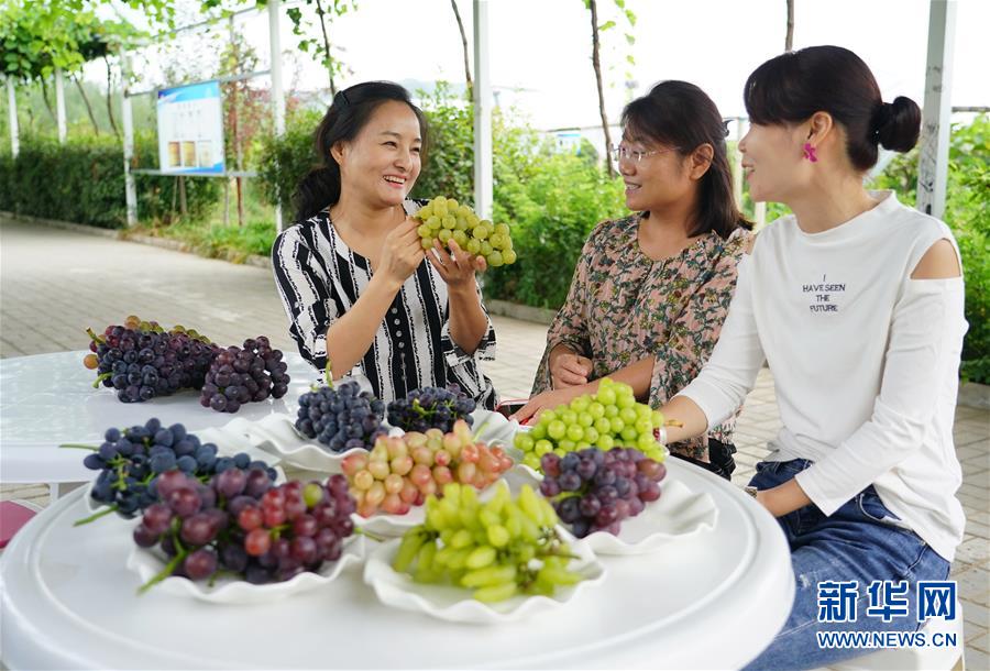王衛(wèi)花(右)與合作社社員在采摘葡萄(8月21日攝)。 新華社記者 邵瑞 攝